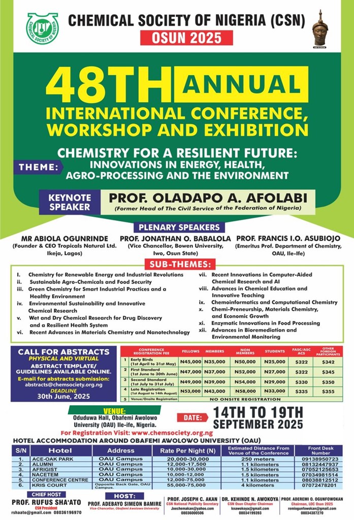 The Chemical Society of Nigeria announces its 48th Annual International Conference, Workshop, and Exhibition, which will be held at Oduduwa Hall, Obafemi Awolowo University (OAU) lle-ife, Nigeria, from Sunday, September 14th, to Friday, September 19th, 2025, under the theme “Chemistry for a Resilient Future: Innovations in Energy, Health, Agro-Processing and the Environment.”